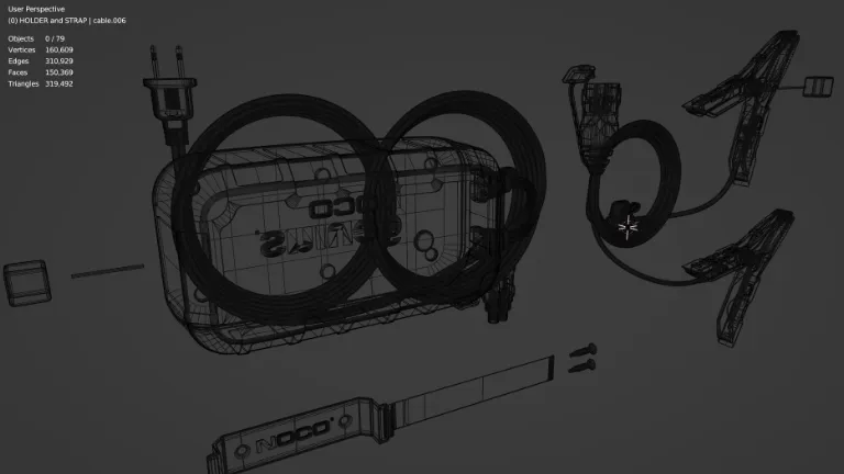Having explored light background in the Toothbrush Demo, it was time to explore how best to achieve a dark scene. Lights were going to be needed to bring out the beauty of the curves, bevels and complex shapes. Two lights plus a HDR environment map was the calculated target souce number for lighting the scene. With this restruction low poly modeling was required to reduce the entire scene poly count to under 320,000 triangles in order to balance the performance desired vs visual quality. All object models were completed first keeping the triangle count as low as possible...about 200,000. The cabling was added last maximizing the number of triangles to keep the loops smooth as possible while staying under our 350,000 triangle target.